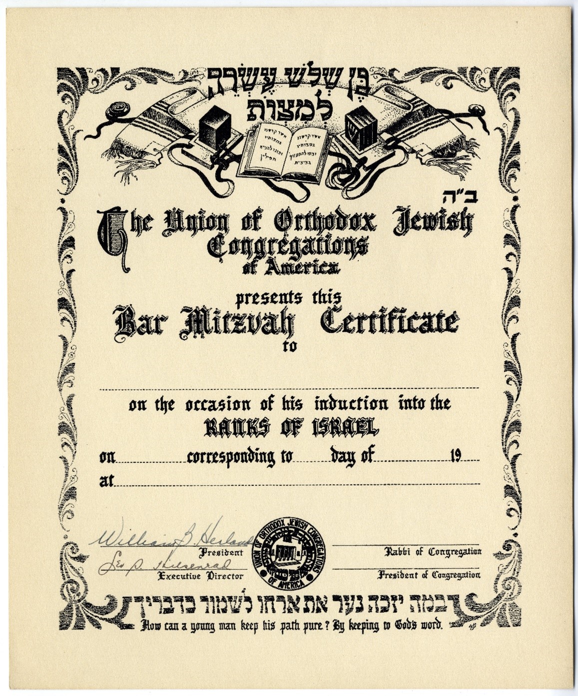 [57_ ] which is 1939/1940, followed by blank spaces to fill in the date as appropriate.Although these certificates were suitable for framing, since they were printed on cardstock or paper they were inherently delicate, ephemeral items unless special care was taken to preserve them; searches of library and museum catalogs indicate that few examples survive. The number of copies printed may have been limited as well.This eye-catching circumcision certificate was illustrated by artist Mendel Bennoon of Chicago, who also created a Rosh Hashanah greeting card during the First World War. Bennoon was born in Grodno, Belarus, in 1879 and died in Chicago in 1952. Little is known about him; internet searches indicate that he registered copyrights on a number of works, including a circumcision certificate in 1923, though it is currently not known whether or not it was identical to this one. He also took out a copyright on a ketubah (Jewish marriage contract) and a Yiddish map of the United States. Tracking down additional works by Bennoon may be worthwhile for a future blog post on this form of Jewish folk art and the career of a Jewish graphic artist.Another certificate designed by Mendel Bennoon is for the birth and naming of a girl, perhaps as a gesture of parity or equality. It is not as colorful or elaborate as the circumcision document; it displays the same flags as the circumcision certificate plus four off kilter stars of David, but it omits the lions of Judah, the eagle, the cherubs, and the abbreviations for mazel tov in the four corners. The certificate is blue and white; blue is not a color typically associated with baby girls though blue may have been used since it was viewed as a traditional Jewish color. In addition to the name of the artist, the certificate bears a copyright: “ROSENBLUM’S BOOK STORE, CHICAGO, ILL.,” a Chicago institution currently located in Skokie, Illinois. Its website states that Rosenblum’s was founded in 1941 on Chicago’s West Side; the date on the certificate is 57__, followed by a blank, indicating that the “daughter” certificate may have been a business idea of Rosenblum’s, since it coincides with the general time frame of Rosenblum’s opening. Certificate for Birth and Naming of a Daughter. Artist: Mendel Bennoon. Rosenblum's Book Store. R27M4 Mart - Order online Steyr Scout Versatile lightweight rifle built on "scout rifle" concept For sale/Lowest price Archives, Arnold Heisler Rabbinical Papers.The bar-mitzvah, a rite of passage marking the entry of a thirteen-year-old boy to Jewish adulthood and responsibility, was sometimes also marked by a certificate, a sign of recognition of full-fledged membership in the world of Jewish ritual. This striking certificate, by an unknown artist, was issued by the Orthodox Union, most likely in the 1950s when William Herlands, signatory on the certificate, was president of the Orthodox Union. The certificate depicts a pair of tefillin, a tallit, and a prayerbook with the blessings for donning these items. It also quotes a relevant verse from Psalms, Tehillim 119:9, in Hebrew and in English translation: “How can a young man keep his path pure? By keeping to God’s word.” The certificate displays an Orthodox Union logo which differs from the organization’s well-known kashruth symbol; this emblem specifically relates to the synagogue aspect of the Orthodox Union, which included the term “congregations” in its name at the time. Bar Mitzvah certificate issued by the Orthodox Union. R27M4 Mart - Order online Steyr Scout Versatile lightweight rifle built on "scout rifle" concept For sale/Lowest price Archives, Arnold Heisler Rabbinical Papers.The original three certificates are in the papers of Rabbi Arnold (Yeshaya) Heisler, z”l, (YUHS 40, YC 44, BRGS 46, RIETS 46) who served as a rabbi in a number of congregations in different parts of the United States. The certificates were part of the arsenal of a congregational rabbi: attractive, tangible, attestations to fidelity to faith; physical symbols of belonging to a religion and people which young Jews and their parents could take pride in.The Arnold Heisler Rabbinical Papers were donated to the R27M4 Mart - Order online Steyr Scout Versatile lightweight rifle built on "scout rifle" concept For sale/Lowest price Archives by his daughter, Sura Jeselsohn.Shulamith Z. Berger, Curator of Special Collections and Hebraica-Judaica